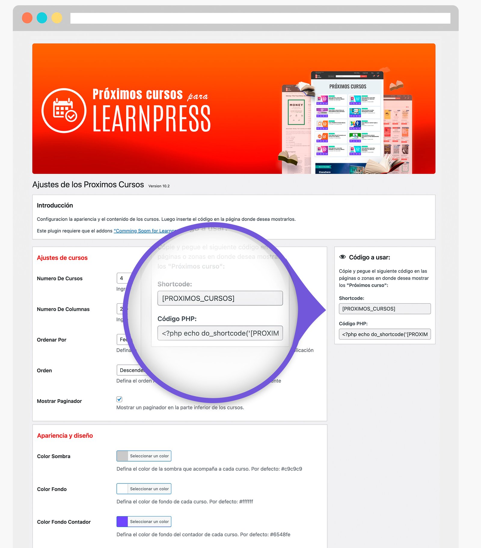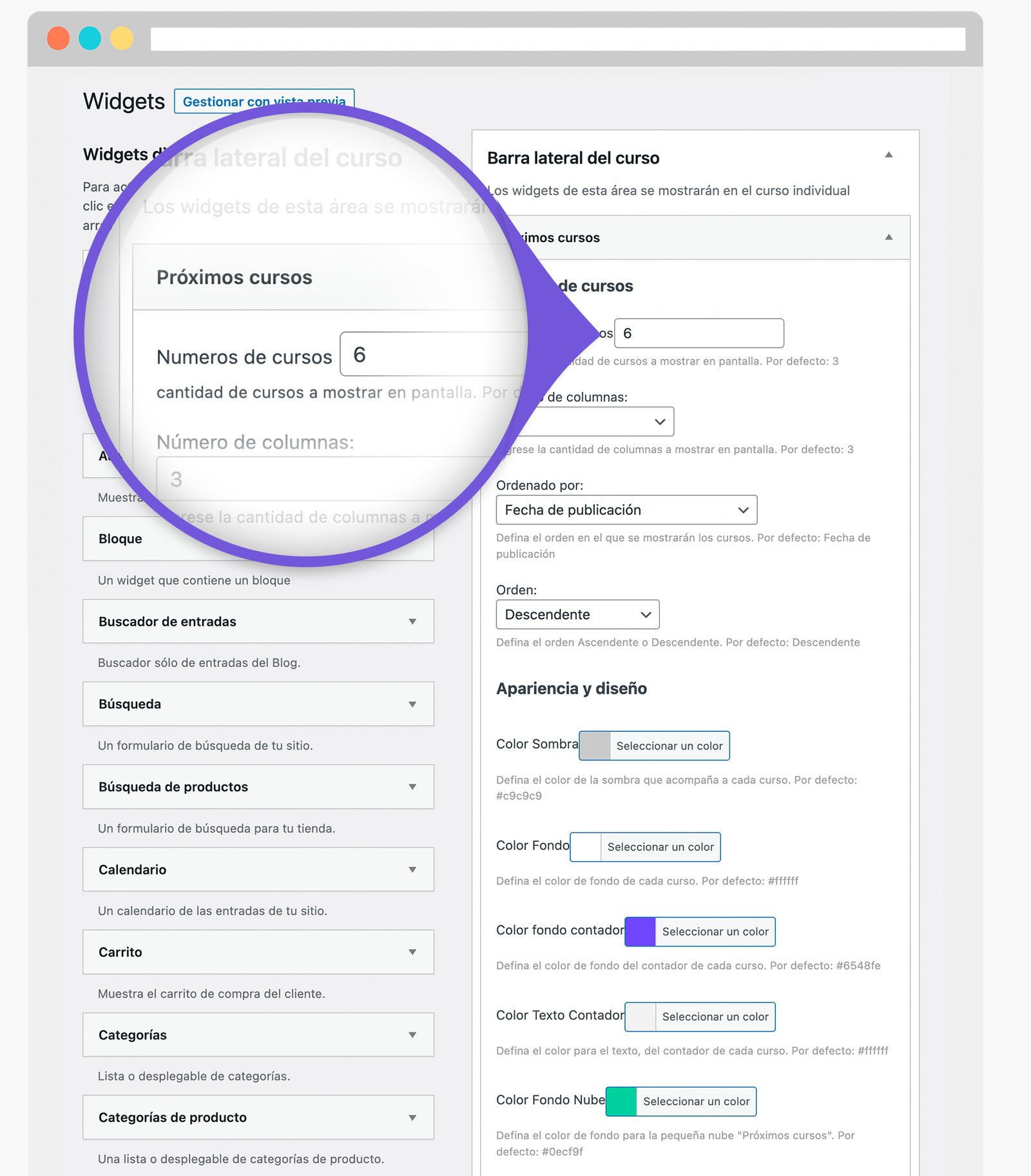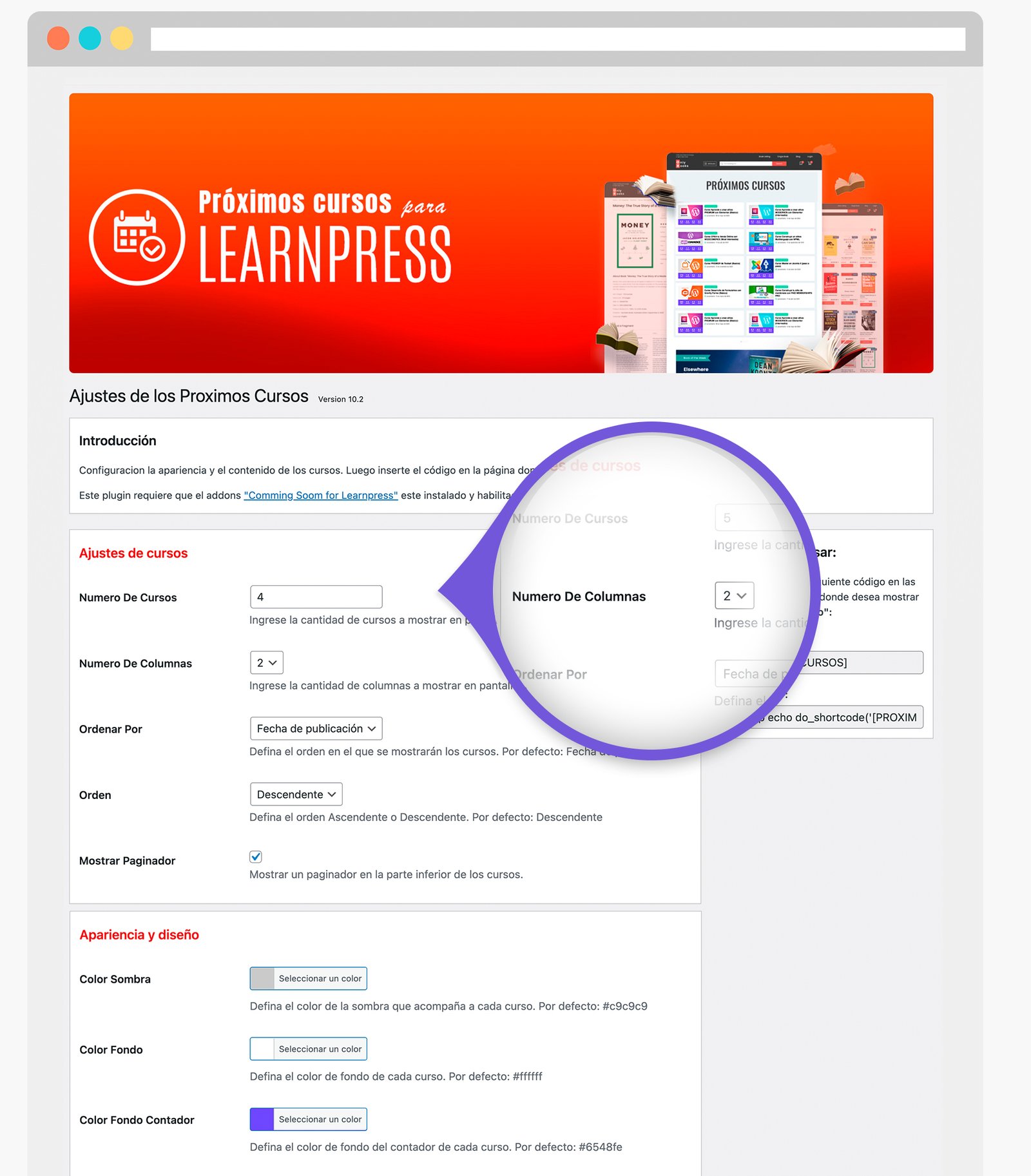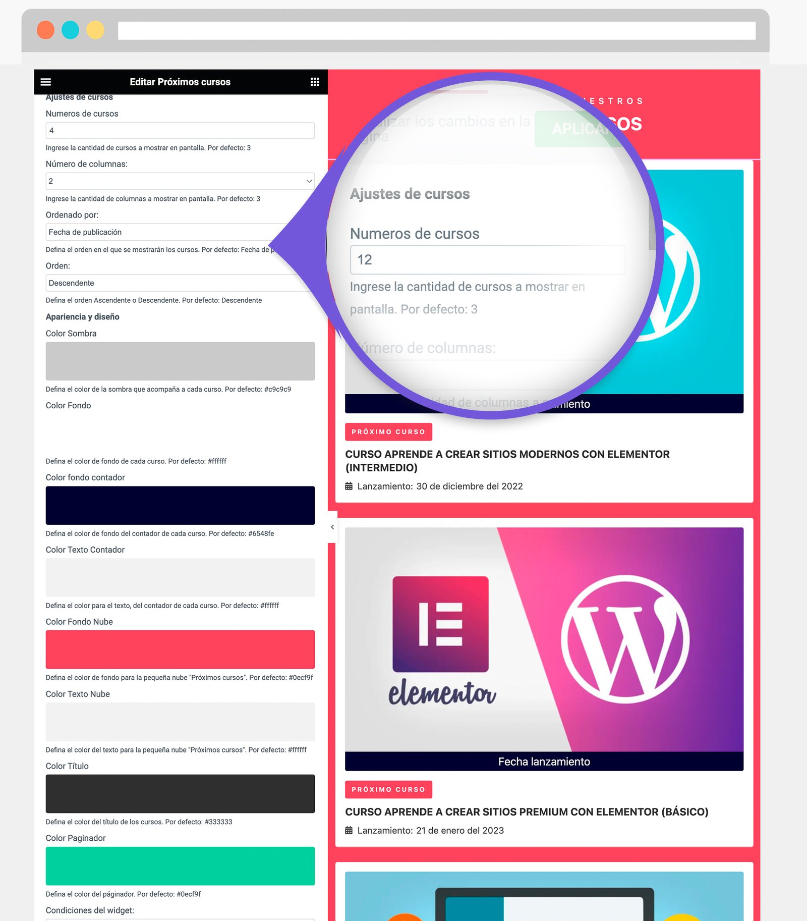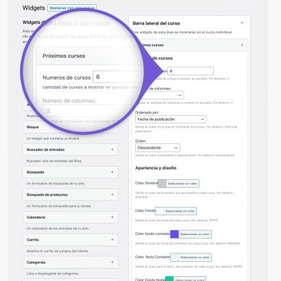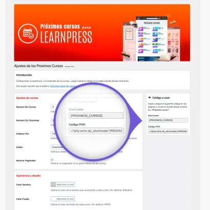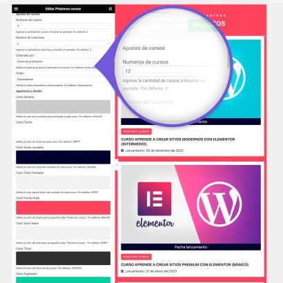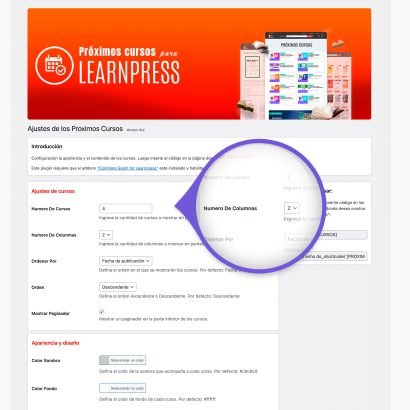 Este plugin le brinda muchas opciones, como definir el diseño y apariencia de los próximos cursos, el número de columnas, configurar la apariencia y mucho más.